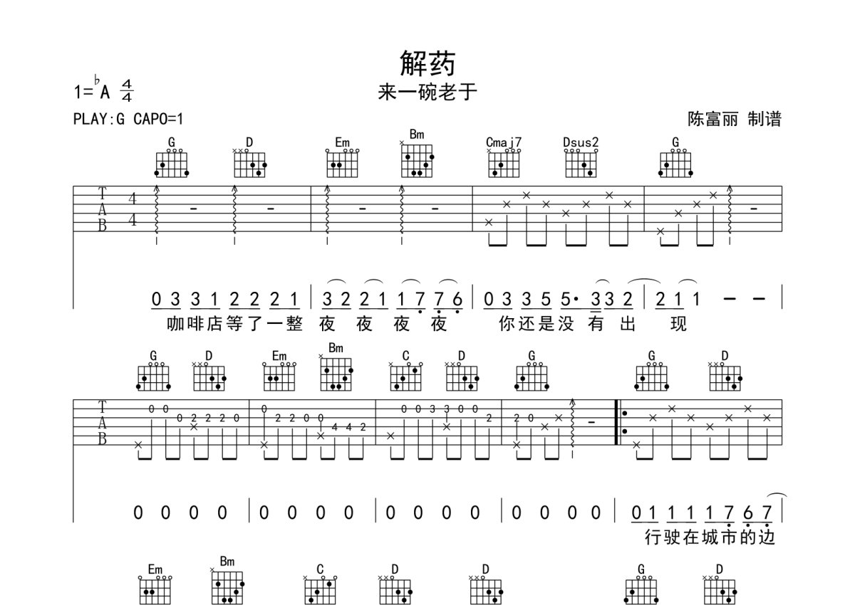 来一碗老于《解药》吉他谱 - G调弹唱六线谱