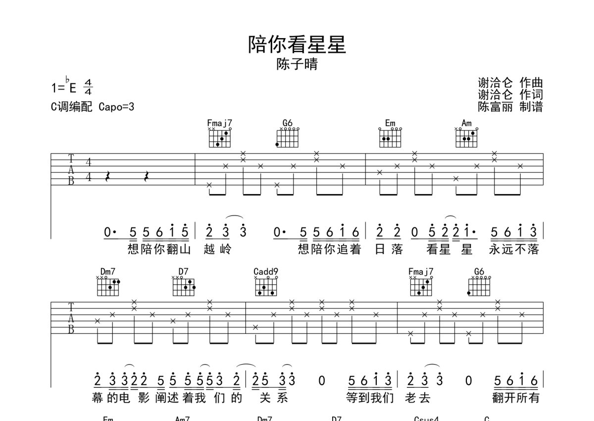 陈子晴《陪你看星星》吉他谱 - C调弹唱六线谱