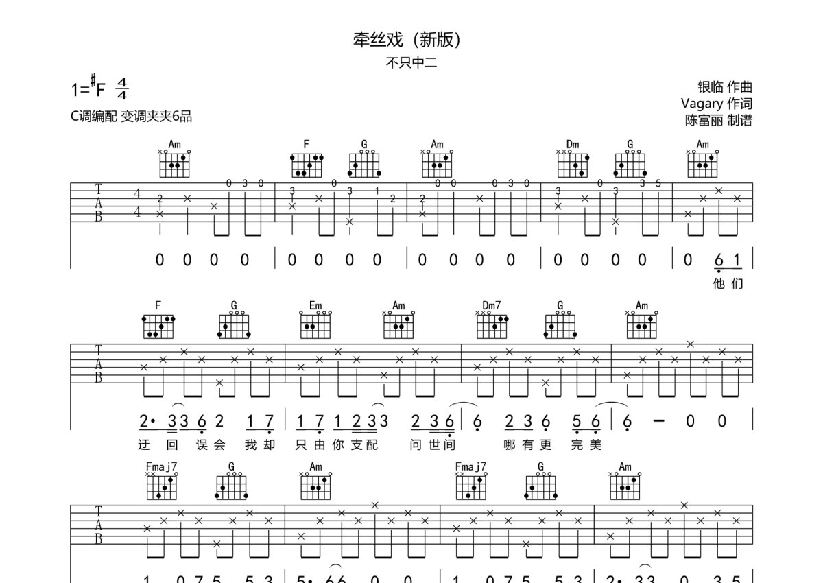 不只中二《牵丝戏(新版)》吉他谱 - C调弹唱六线谱