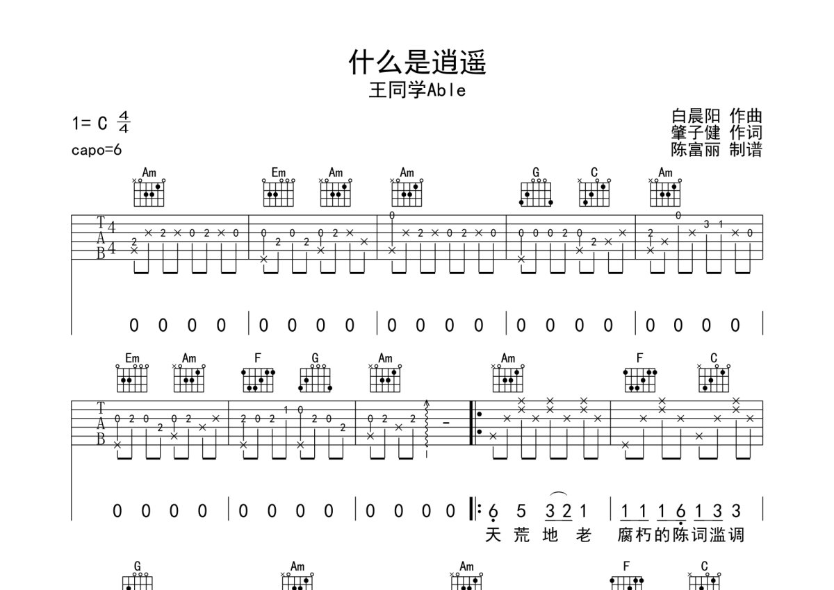 王同学Able《什么是逍遥》吉他谱 - C调弹唱六线谱