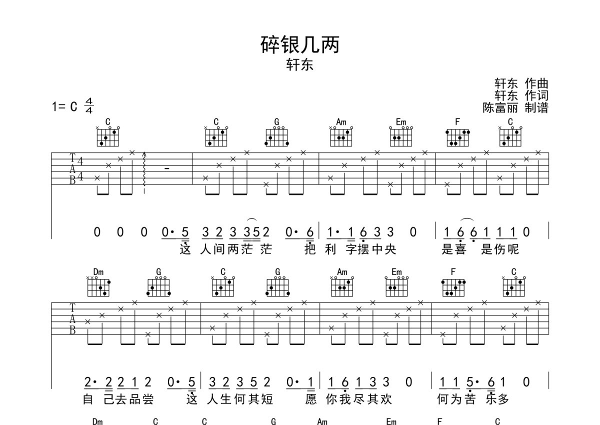 轩东《碎银几两》吉他谱 - C调弹唱六线谱