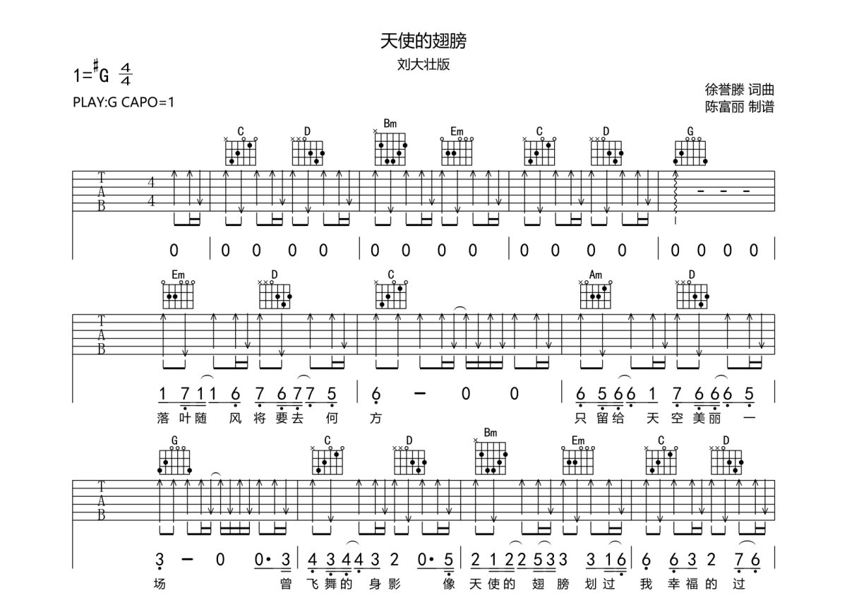 刘大壮《天使的翅膀》吉他谱 - G调弹唱六线谱