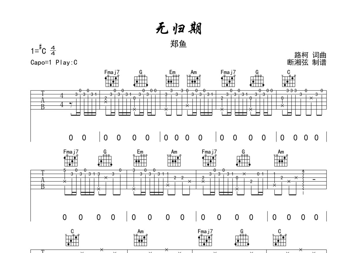 郑鱼《无归期》吉他谱 - C调弹唱六线谱