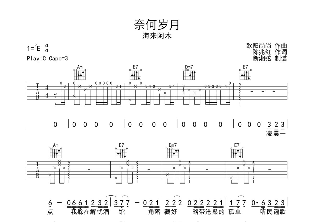 《奈何岁月》是海来阿木演唱的一首歌曲,本吉他谱采用的是C调指法编配,这份吉他谱共有三张高清图谱,图谱由 @月隐云先知 编配上传,图谱使用六线谱编配,包含吉他和弦指法、简谱以及歌词部分,使用这份奈何岁月吉他谱,可以让你更加方便地掌握这首歌曲的弹唱技巧,快来尝试吧。海来阿木《奈何岁月》吉他谱_C调吉他弹唱谱。