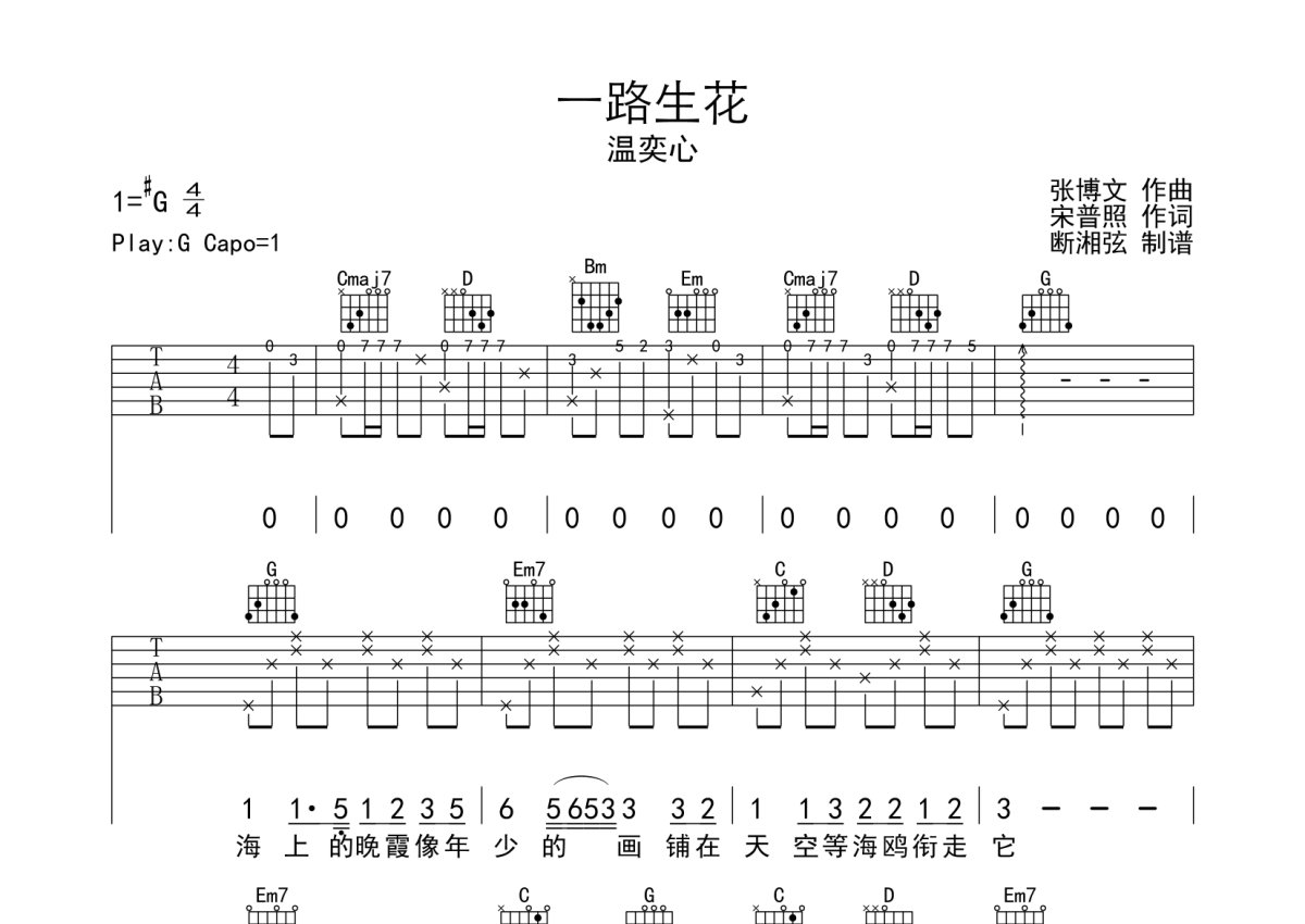 温奕言《一路生花》吉他谱 - G调弹唱六线谱