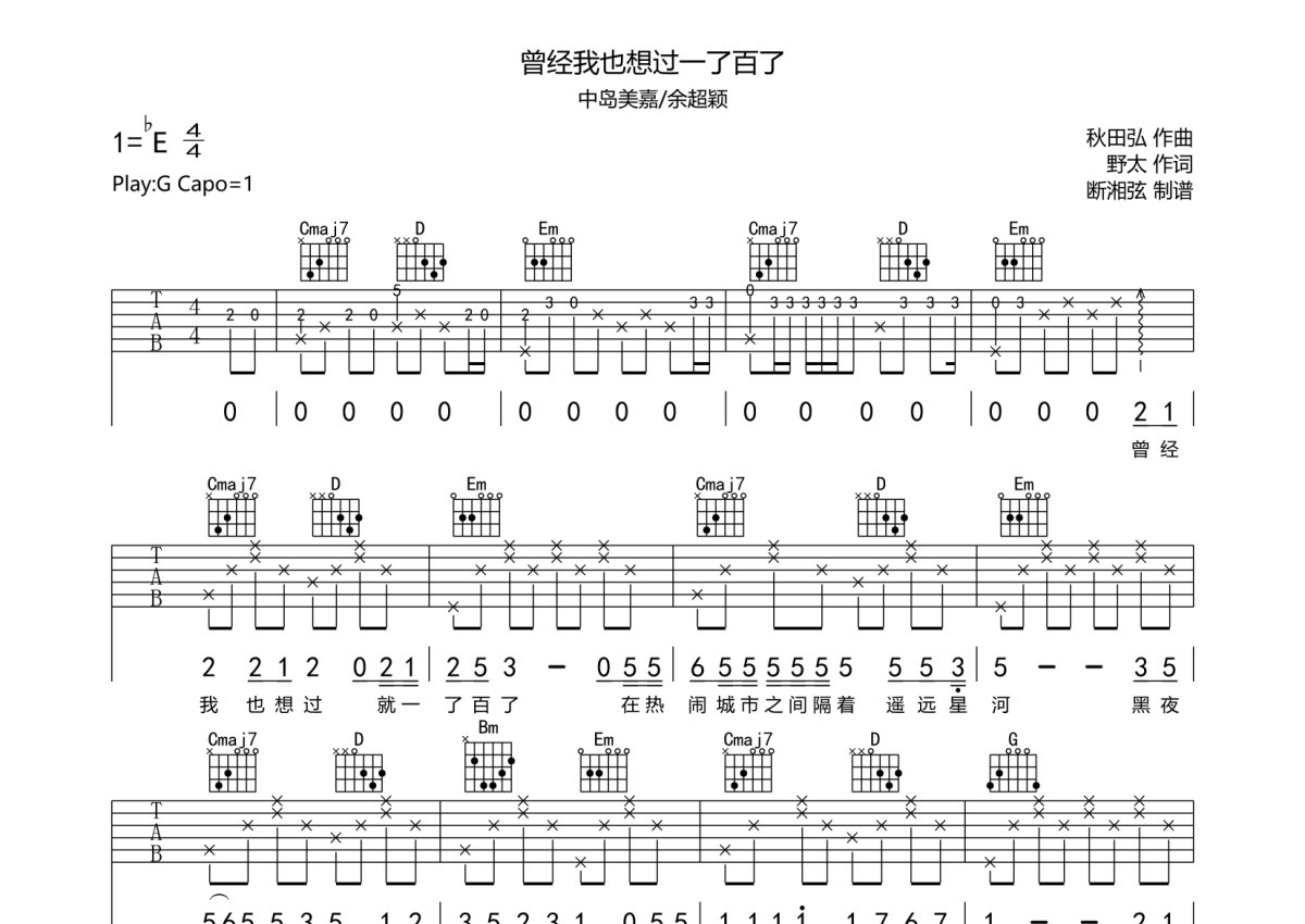 《曾经我也想过一了百了》是余超颖演唱的一首歌曲,本吉他谱采用的是G调指法编配,这份吉他谱共有五张高清图谱,图谱由 @月隐云先知 编配上传,图谱使用六线谱编配,包含吉他和弦指法、简谱以及歌词部分,使用这份曾经我也想过一了百了吉他谱,可以让你更加方便地掌握这首歌曲的弹唱技巧,快来尝试吧。余超颖《曾经我也想过一了百了》吉他谱_G调吉他弹唱谱。