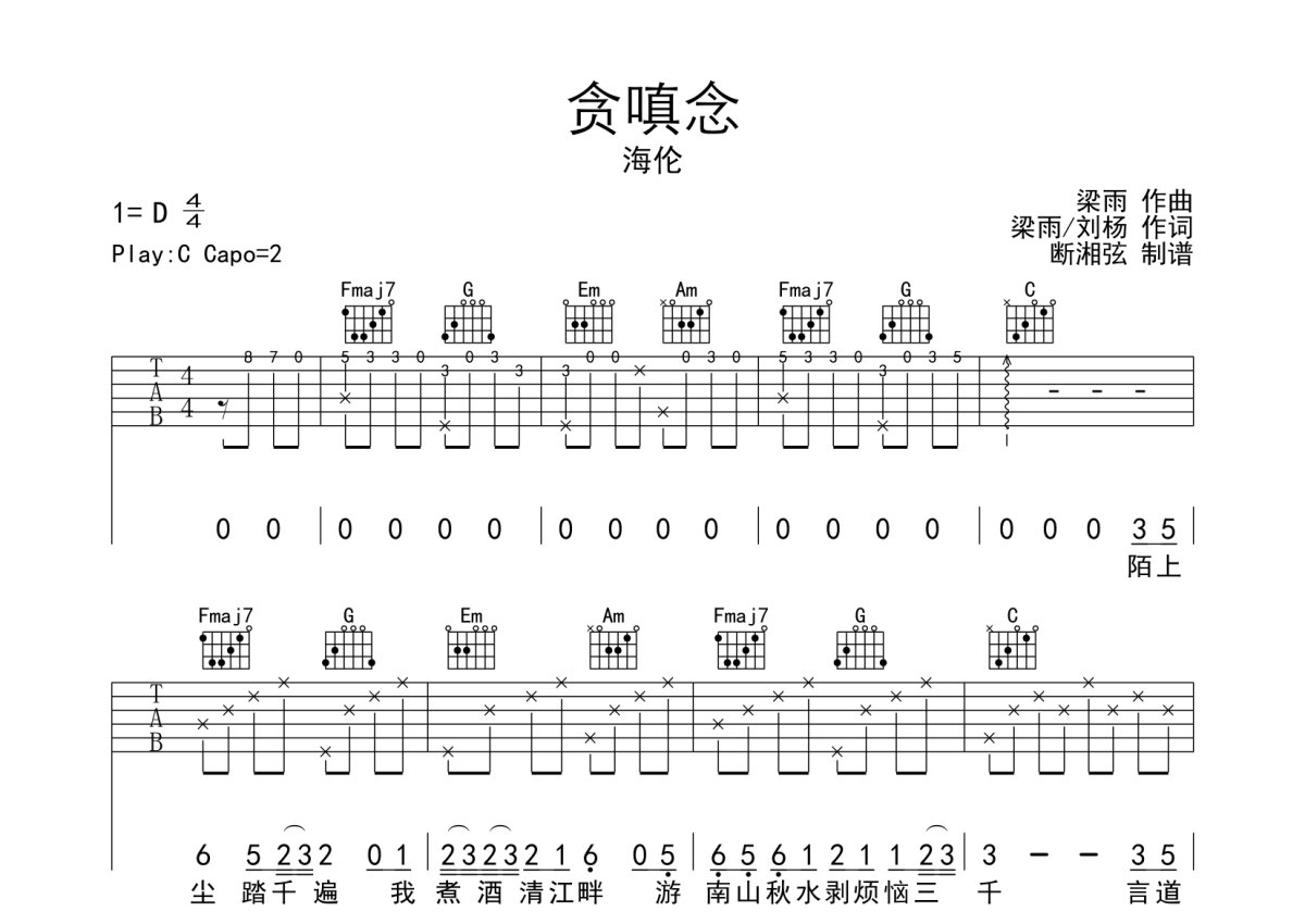 《贪嗔念》是海伦演唱的一首歌曲,本吉他谱采用的是C调指法编配,这份吉他谱共有三张高清图谱,图谱由 @月隐云先知 编配上传,图谱使用六线谱编配,包含吉他和弦指法、简谱以及歌词部分,使用这份贪嗔念吉他谱,可以让你更加方便地掌握这首歌曲的弹唱技巧,快来尝试吧。海伦《贪嗔念》吉他谱_C调吉他弹唱谱。