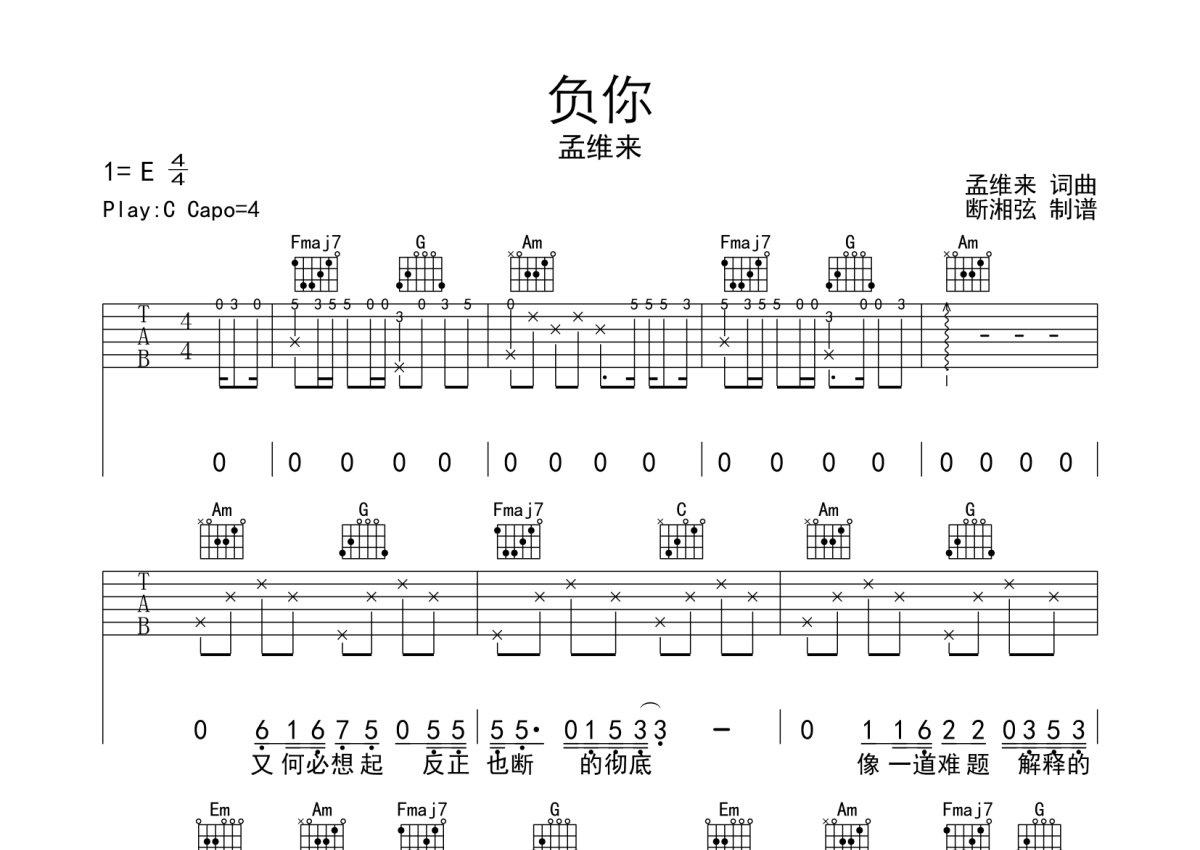 孟维来《负你》吉他谱 - C调弹唱六线谱
