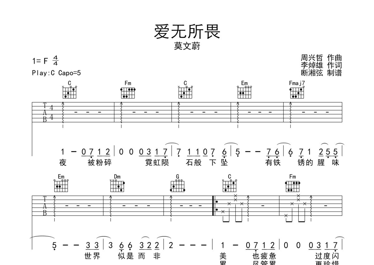 莫文蔚《爱无所畏》吉他谱 - C调弹唱六线谱