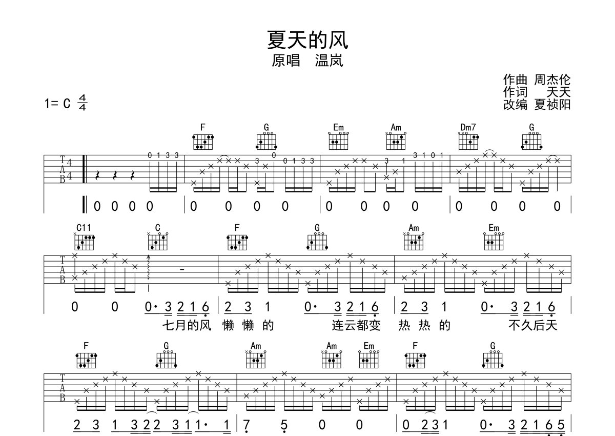 温岚《夏天的风》吉他谱 - C调弹唱六线谱