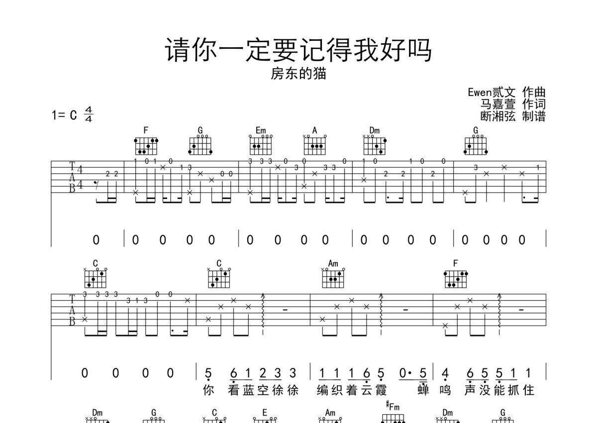 房东的猫《请你一定要记得我好吗》吉他谱 - C调弹唱六线谱