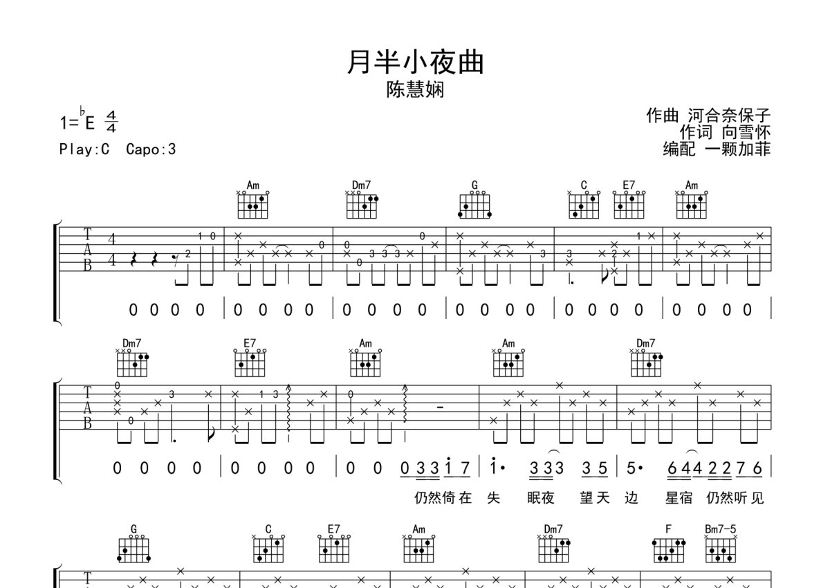 陈慧娴《月半小夜曲》吉他谱 - C调弹唱六线谱 - 完整编配版