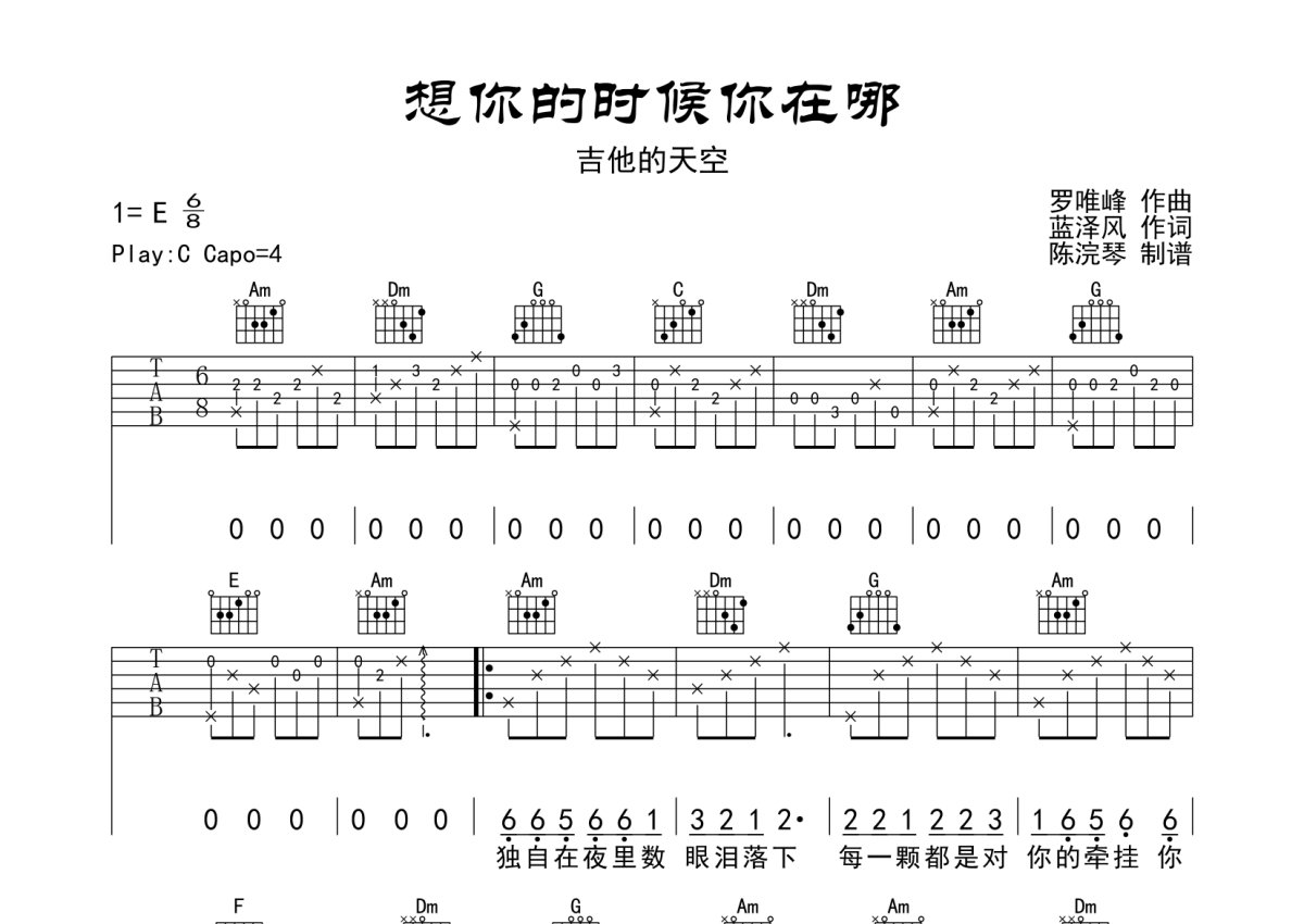 吉他的天空《想你的时候你在哪》吉他谱 - C调弹唱六线谱