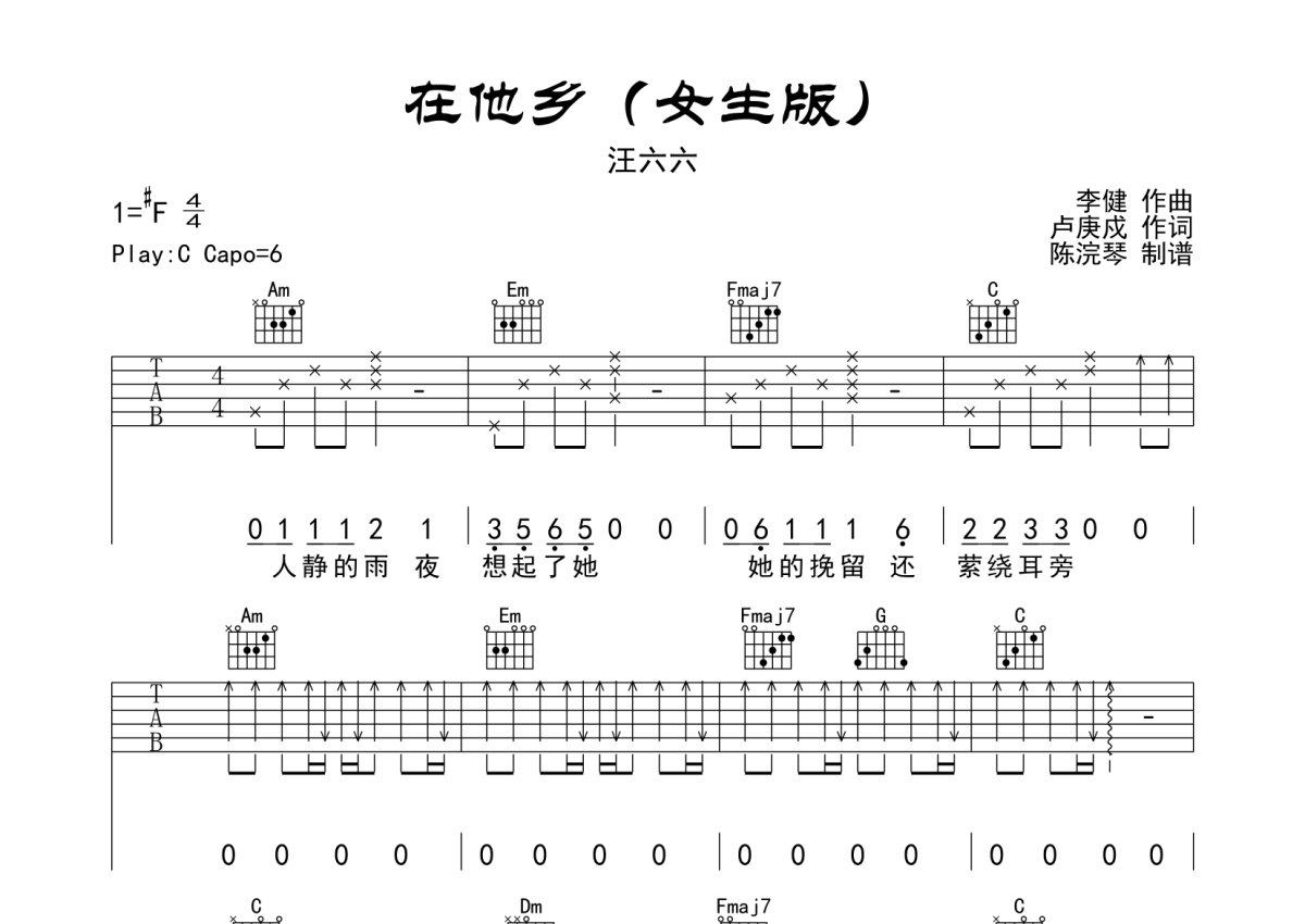 汪六六《在他乡》吉他谱 - C调弹唱六线谱 - 女生版