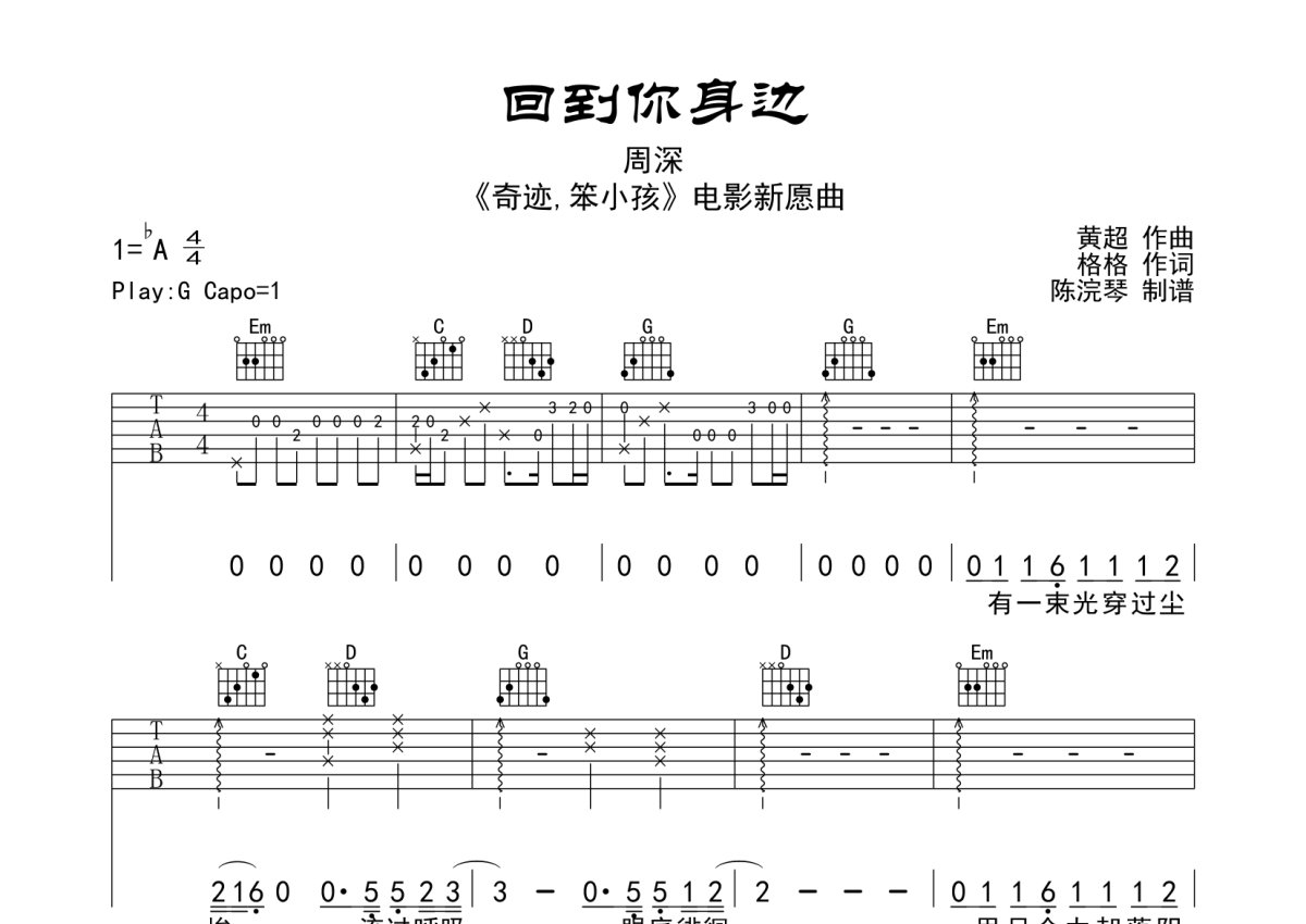 周深《回到你身边》吉他谱 - G调弹唱六线谱