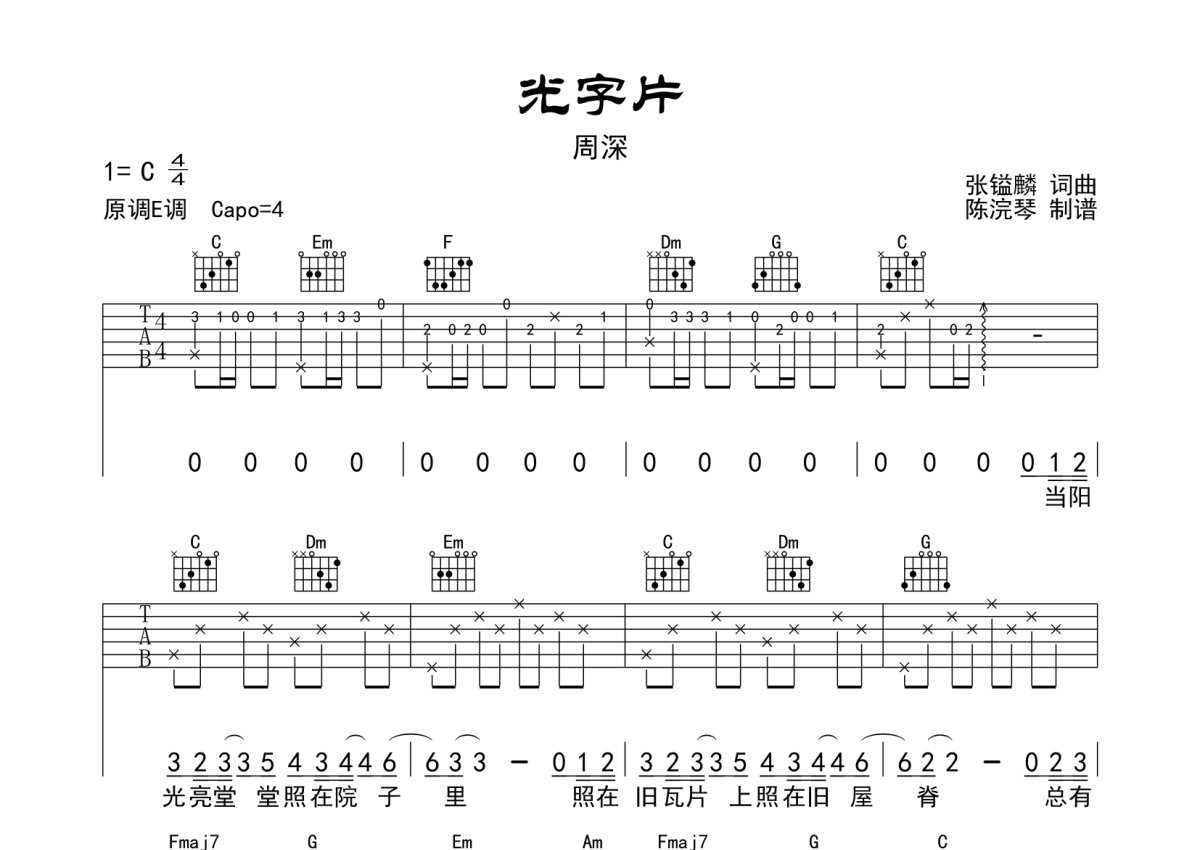周深《光字片》吉他谱 - C调弹唱六线谱