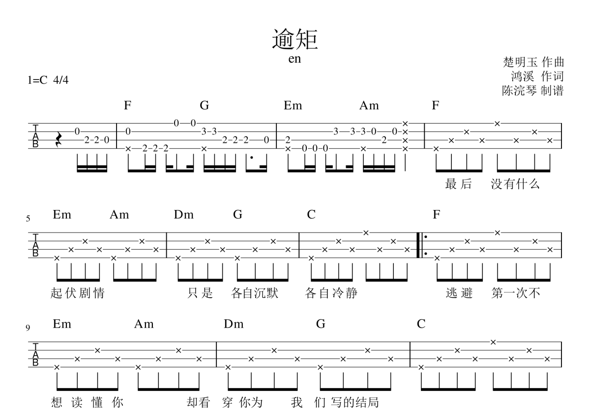 《逾矩》是en演唱的一首歌曲,本尤克里里谱采用的是C调指法编配,这份尤克里里谱共有两张高清图谱,图谱由 @月隐云先知 编配上传,图谱使用四线谱编配,包含尤克里里和弦指法、简谱以及歌词部分,使用这份逾矩尤克里里谱,可以让你更加方便地掌握这首歌曲的弹唱技巧,快来尝试吧。en《逾矩》_C调尤克里里谱。