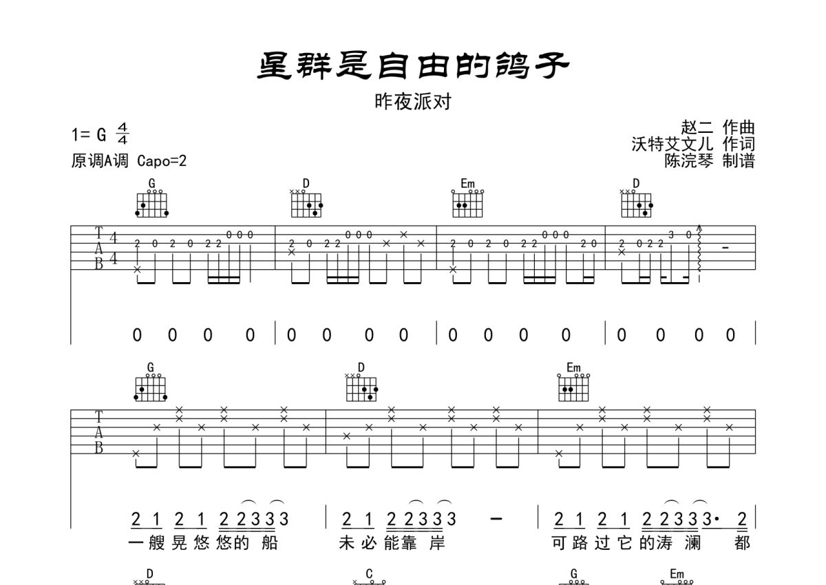 昨夜派对《星群是自由的鸽子》吉他谱 - G调弹唱六线谱