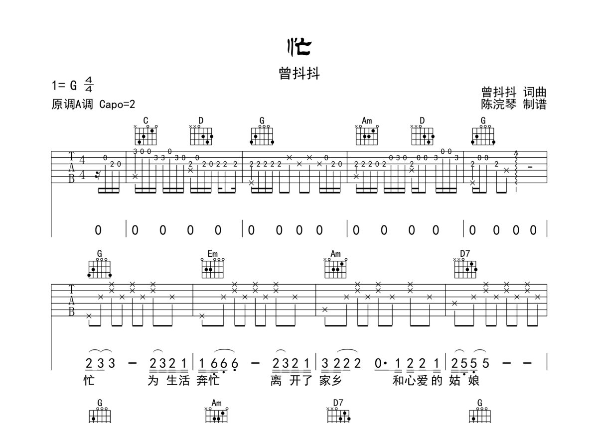 曾抖抖《忙》吉他谱 - G调弹唱六线谱