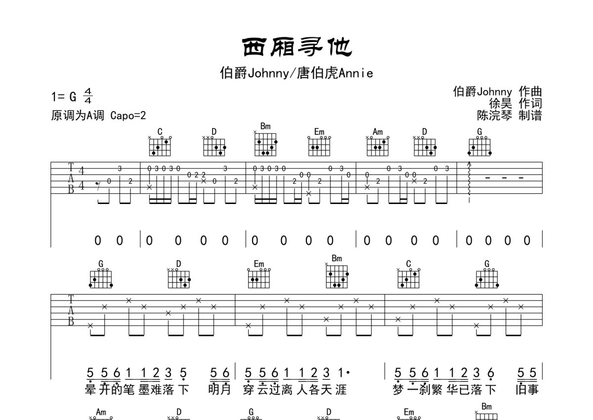 伯爵Johnny /唐伯虎Annie《西厢寻他》吉他谱 - G调弹唱六线谱