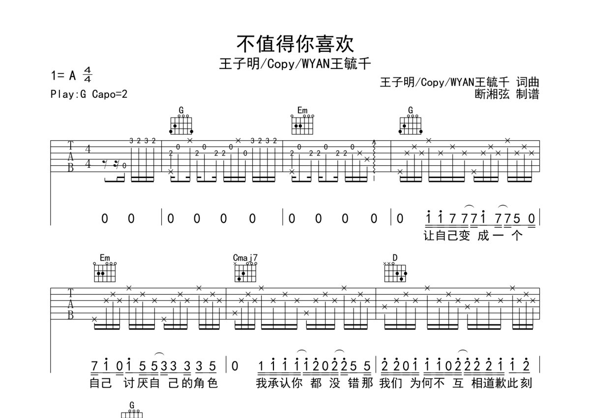 王子明/Copy/WYAN王毓千《不值得你喜欢》吉他谱 - G调弹唱六线谱