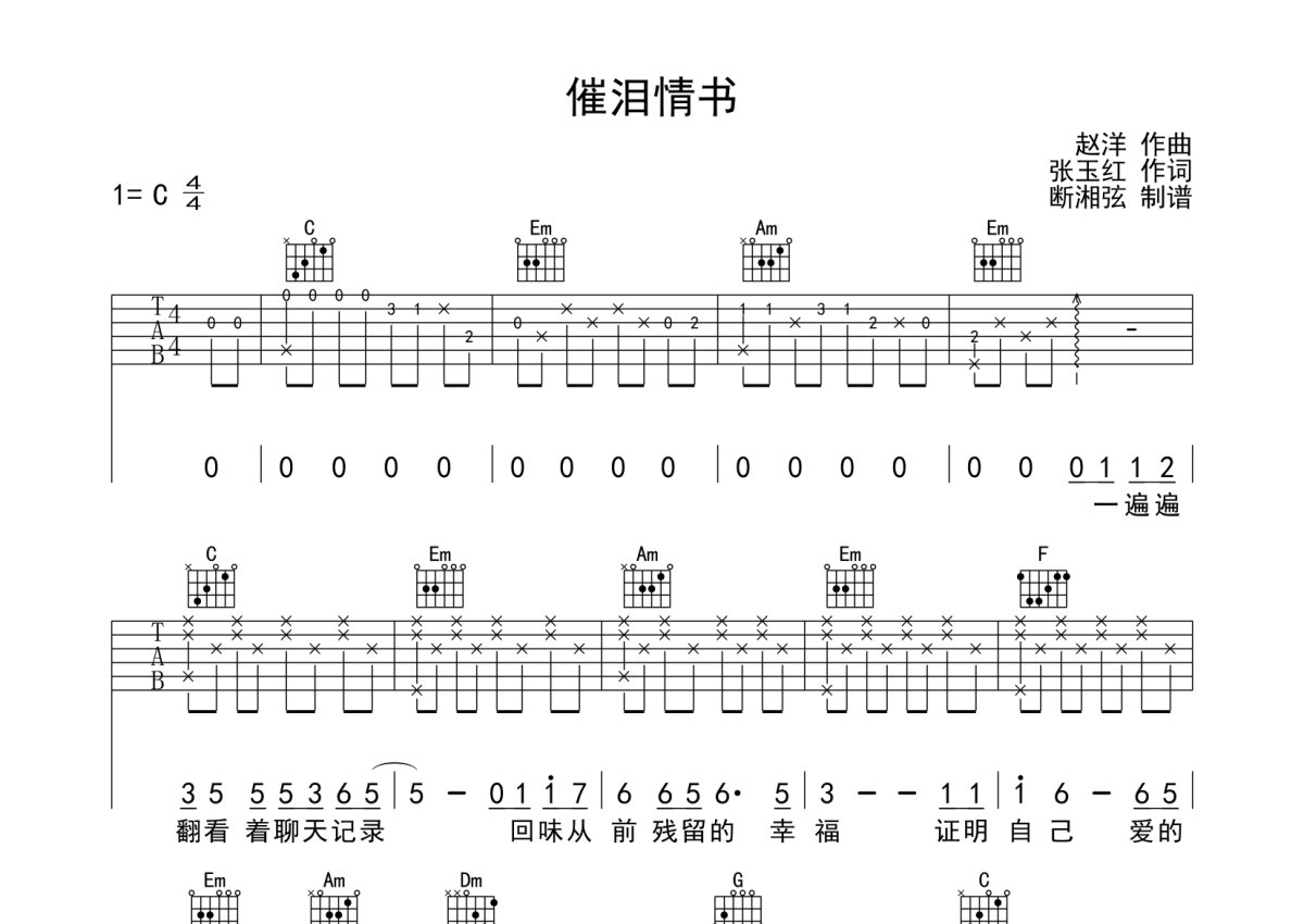 《催泪情书》是倪尔萍演唱的一首歌曲,本吉他谱采用的是C调指法编配,这份吉他谱共有三张高清图谱,图谱由 @月隐云先知 编配上传,图谱使用六线谱编配,包含吉他和弦指法、简谱以及歌词部分,使用这份催泪情书吉他谱,可以让你更加方便地掌握这首歌曲的弹唱技巧,快来尝试吧。倪尔萍《催泪情书》吉他谱_C调吉他弹唱谱。