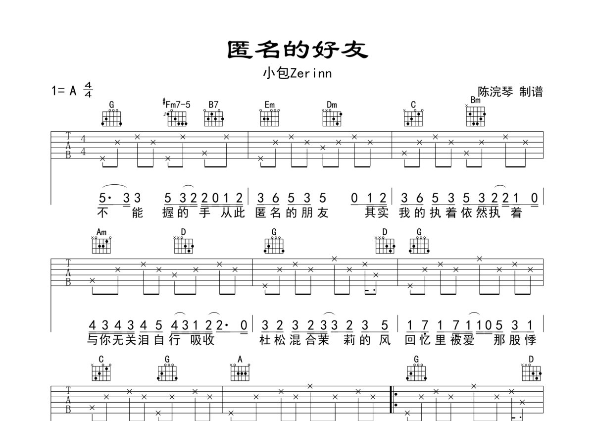 小包Zerinn《匿名的好友》吉他谱 - A调弹唱六线谱