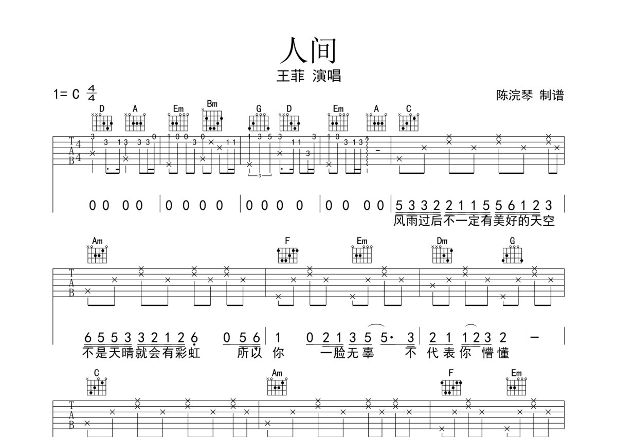 王菲《人间》吉他谱 - C调弹唱六线谱