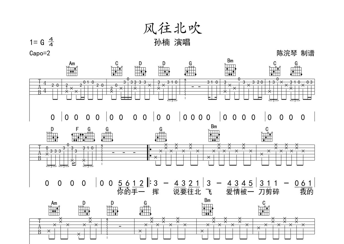 孙楠《风往北吹》吉他谱 - G调弹唱六线谱