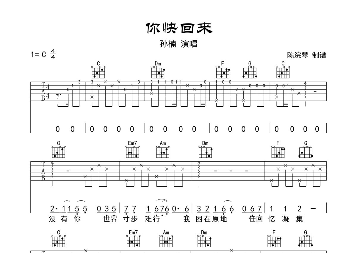孙楠《你快回来》吉他谱 - C调弹唱六线谱