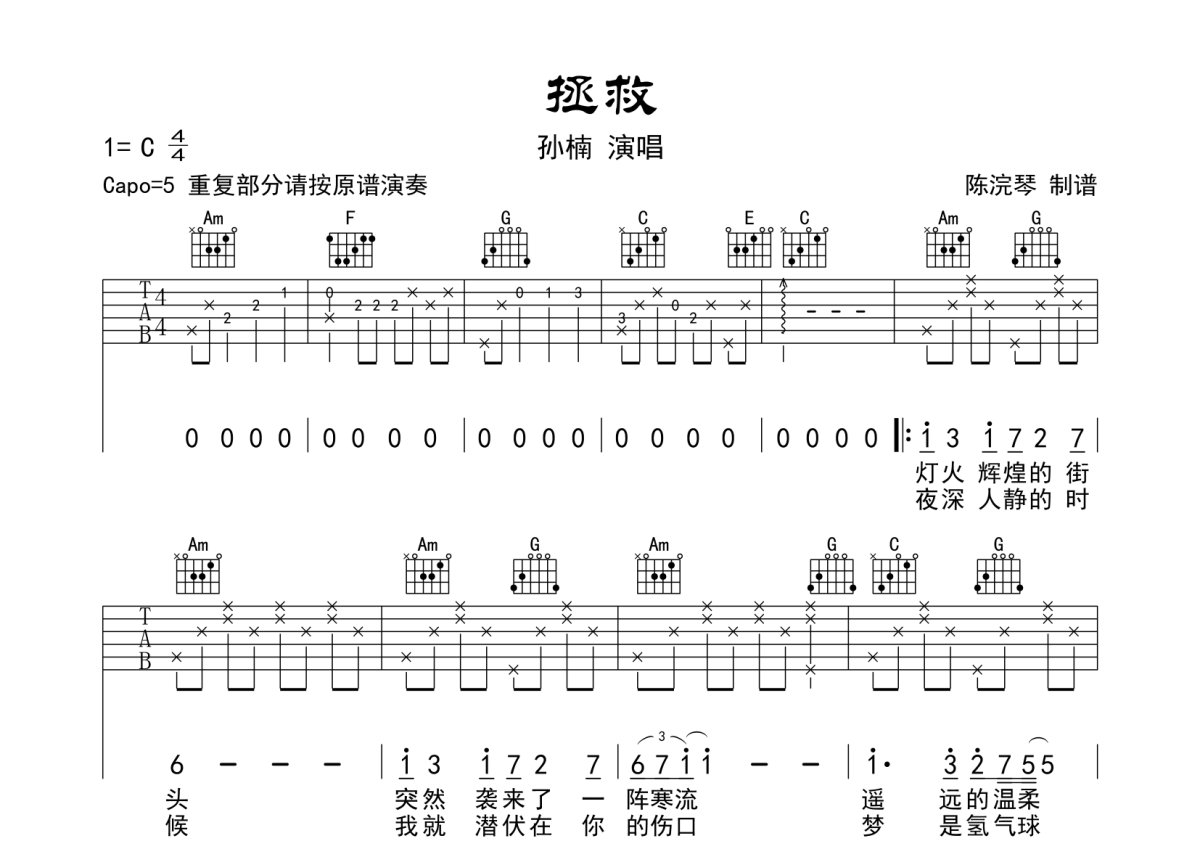 孙楠《拯救》吉他谱 - C调弹唱六线谱