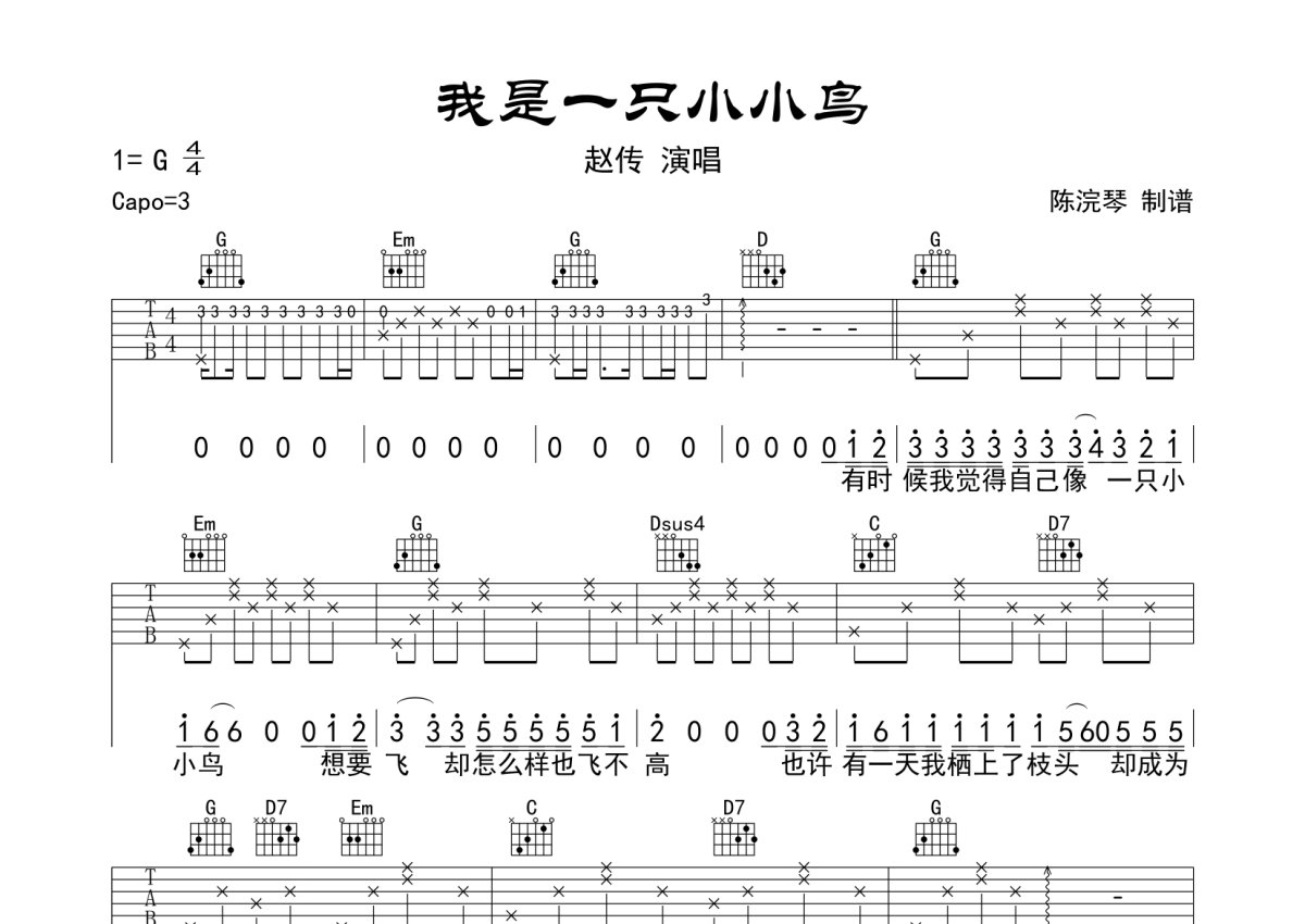 赵传《我是一只小小鸟》吉他谱 - G调弹唱六线谱