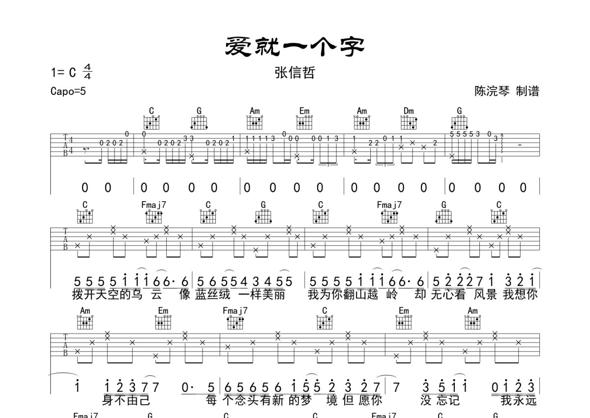 张信哲《爱就一个字》吉他谱 - C调弹唱六线谱