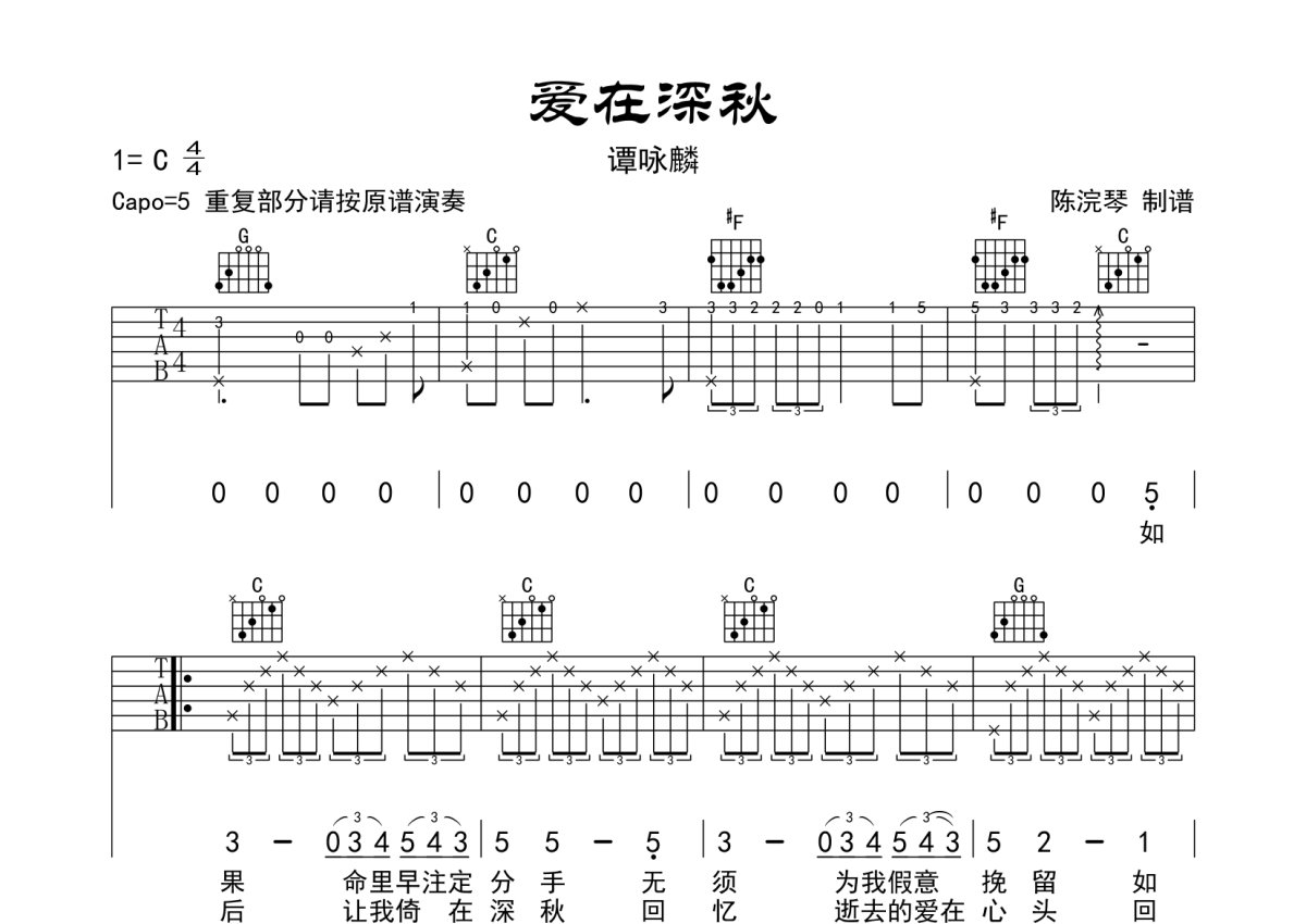 谭咏麟《爱在深秋》吉他谱 - C调弹唱六线谱