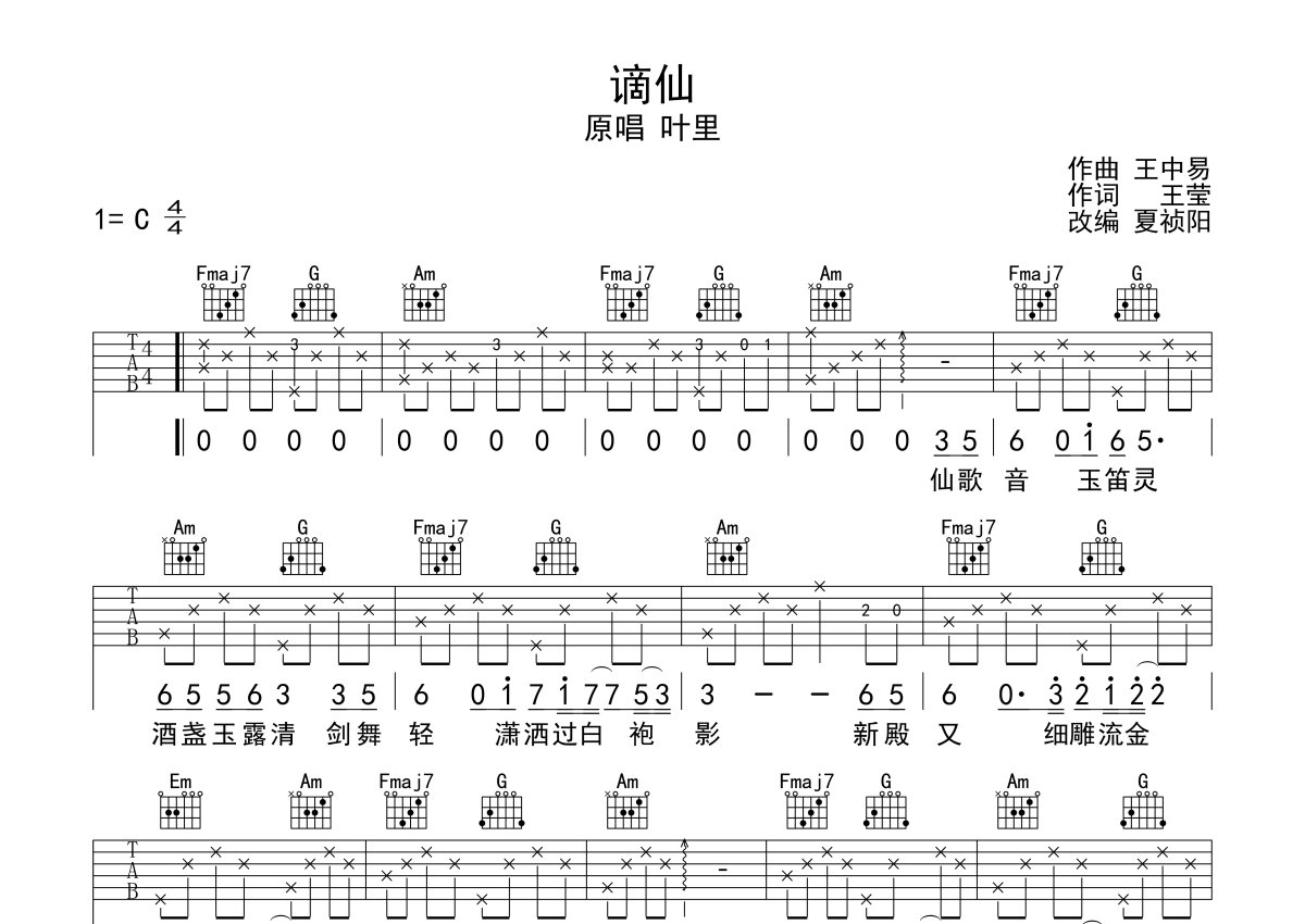 叶里《谪仙》吉他谱 - C调弹唱六线谱