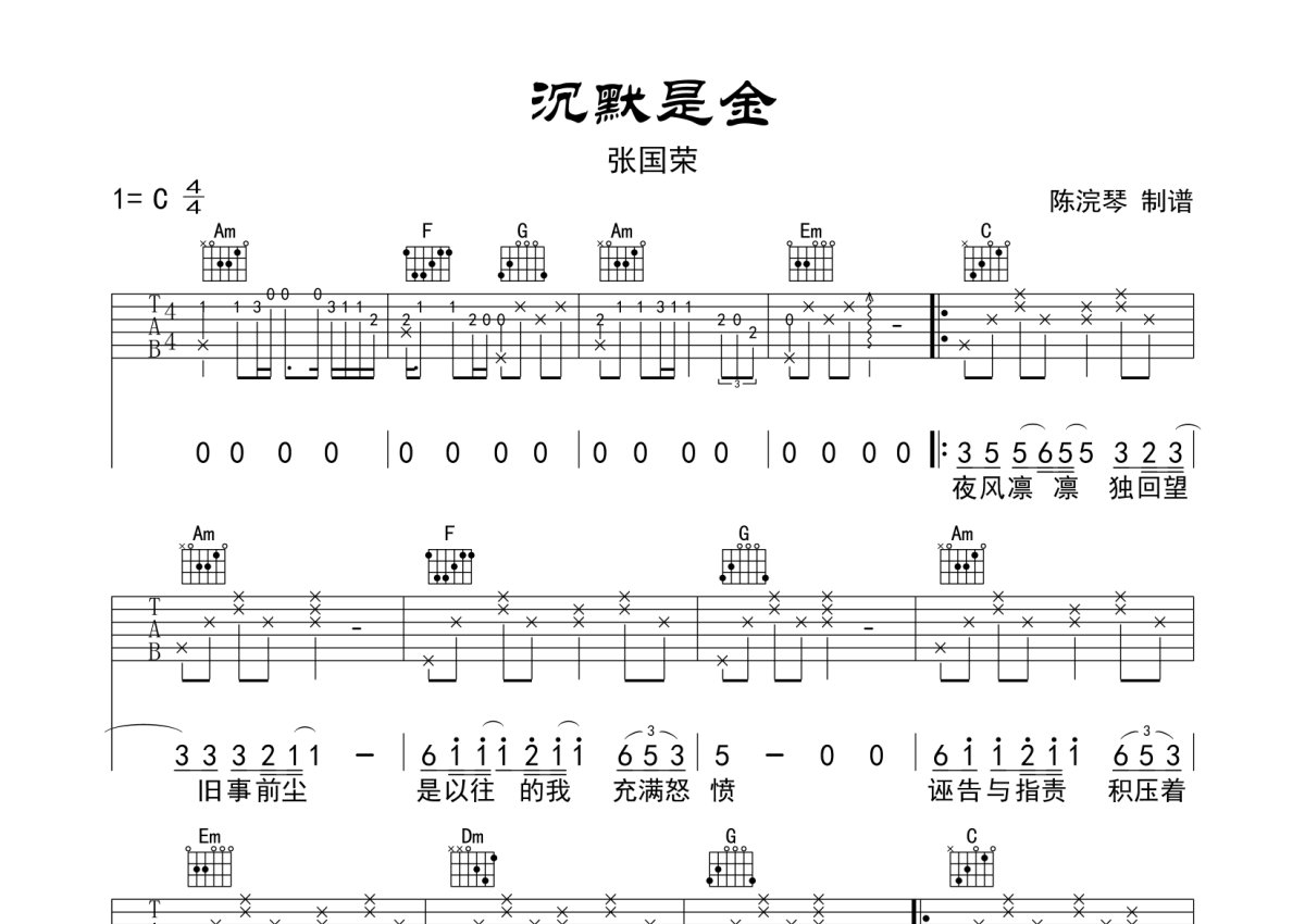 张国荣《沉默是金》吉他谱 - C调弹唱六线谱