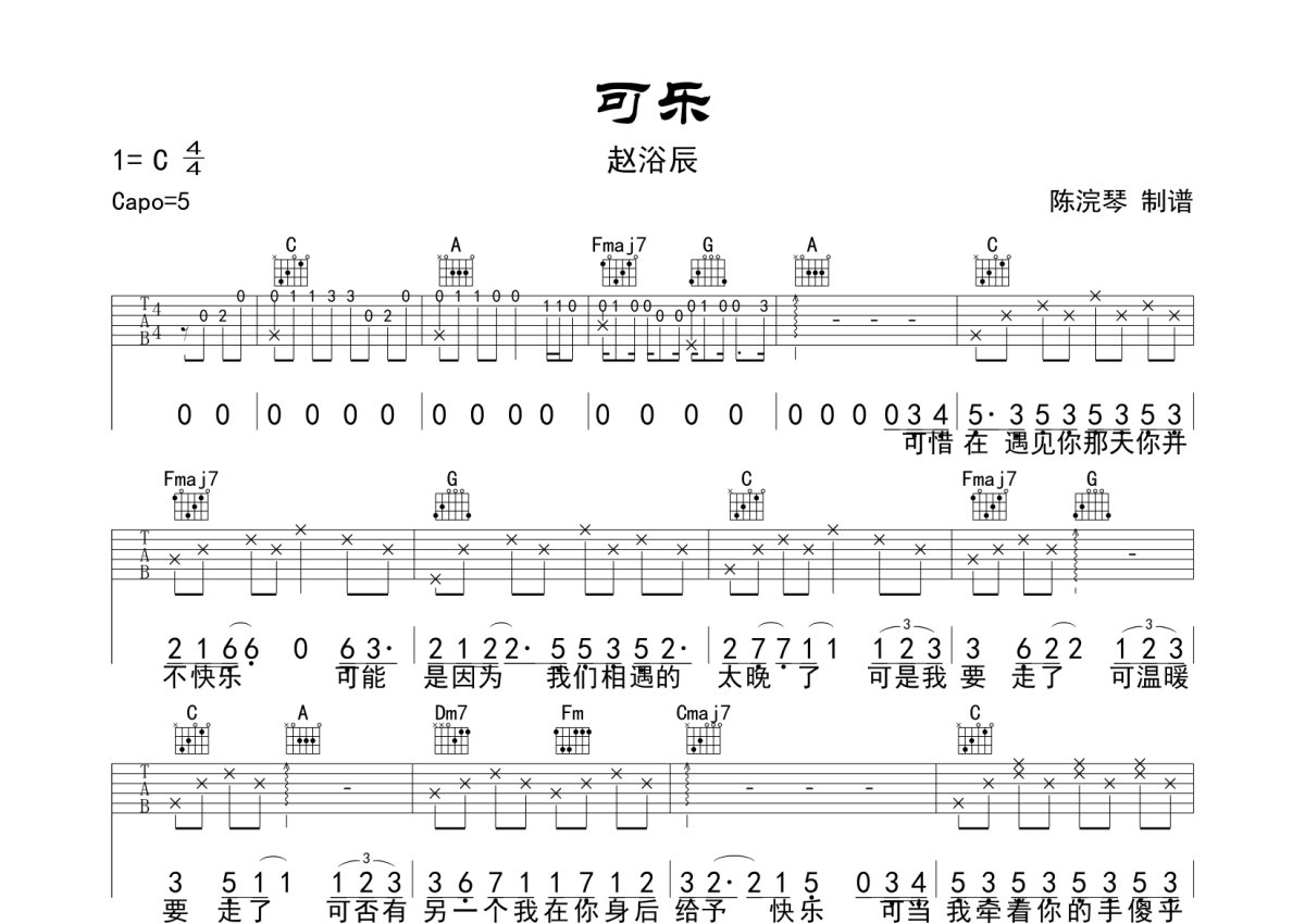赵紫骅《可乐》吉他谱 - C调弹唱六线谱 - 拨弦版
