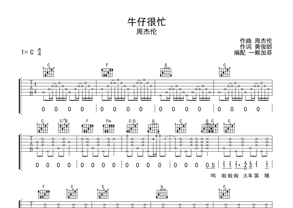 周杰伦《牛仔很忙》吉他谱 - C调弹唱六线谱 - 简易入门弹唱版