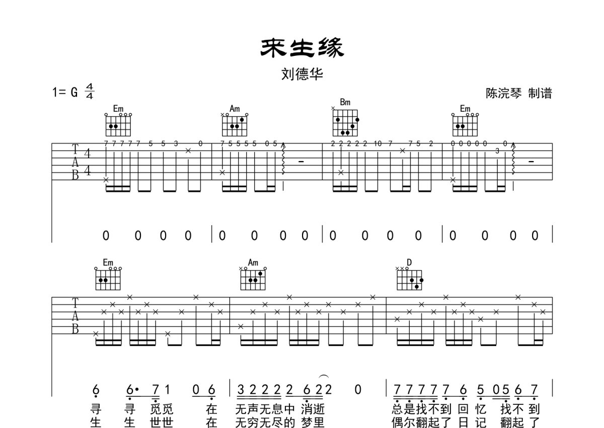 《来生缘》是刘德华演唱的一首歌曲,本吉他谱采用的是G调指法编配,这份吉他谱共有两张高清图谱,图谱由 @月隐云先知 编配上传,图谱使用六线谱编配,包含吉他和弦指法、简谱以及歌词部分,使用这份来生缘吉他谱,可以让你更加方便地掌握这首歌曲的弹唱技巧,快来尝试吧。刘德华《来生缘》吉他弹唱谱,采用G调指法编配,月隐云先知编配出品,共有2张高清图谱,免翻页排版设计。