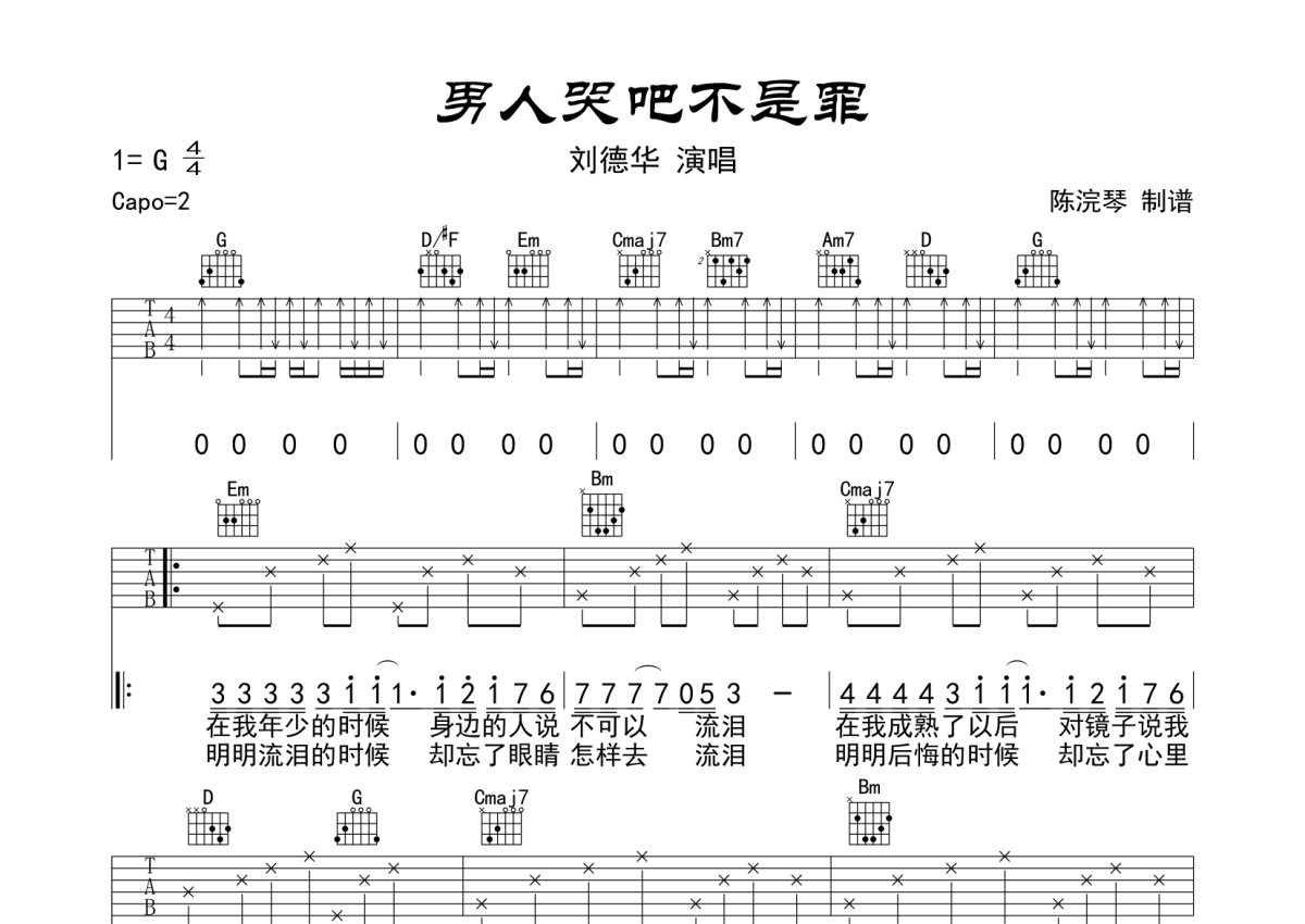 《男人哭吧不是罪》是刘德华演唱的一首歌曲,本吉他谱采用的是G调指法编配,这份吉他谱共有两张高清图谱,图谱由 @月隐云先知 编配上传,图谱使用六线谱编配,包含吉他和弦指法、简谱以及歌词部分,使用这份男人哭吧不是罪吉他谱,可以让你更加方便地掌握这首歌曲的弹唱技巧,快来尝试吧。刘德华《男人哭吧不是罪》吉他弹唱谱,采用G调指法编配,月隐云先知编配出品,共有2张高清图谱,免翻页排版设计。