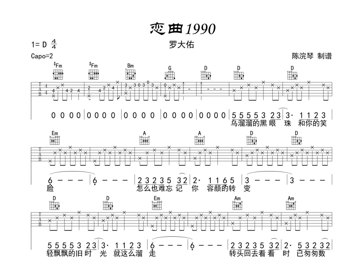 《恋曲1990》是罗大佑演唱的一首歌曲,本吉他谱采用的是C调指法编配,这份吉他谱共有两张高清图谱,图谱由 @月隐云先知 编配上传,图谱使用六线谱编配,包含吉他和弦指法、简谱以及歌词部分,使用这份恋曲1990吉他谱,可以让你更加方便地掌握这首歌曲的弹唱技巧,快来尝试吧。罗大佑《恋曲1990》吉他弹唱谱,采用D调指法编配,月隐云先知编配出品,共有2张高清图谱,免翻页排版设计。