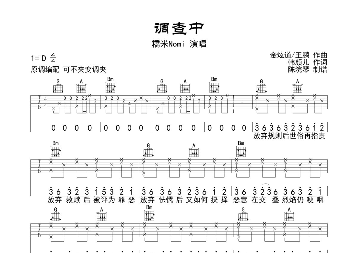 糯米Nomi《调查中》吉他谱 - D调弹唱六线谱 - 原调编配