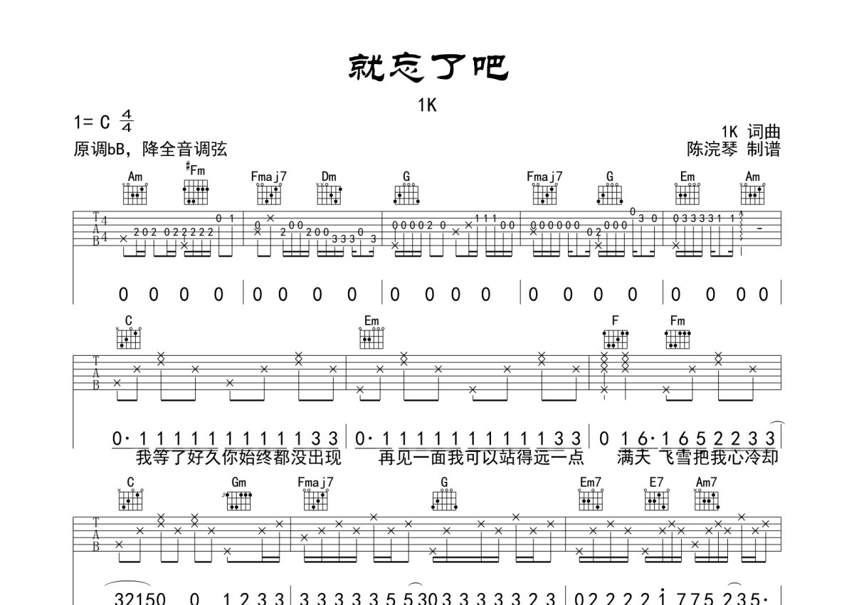 1K《就忘了吧》吉他谱 - C调弹唱六线谱