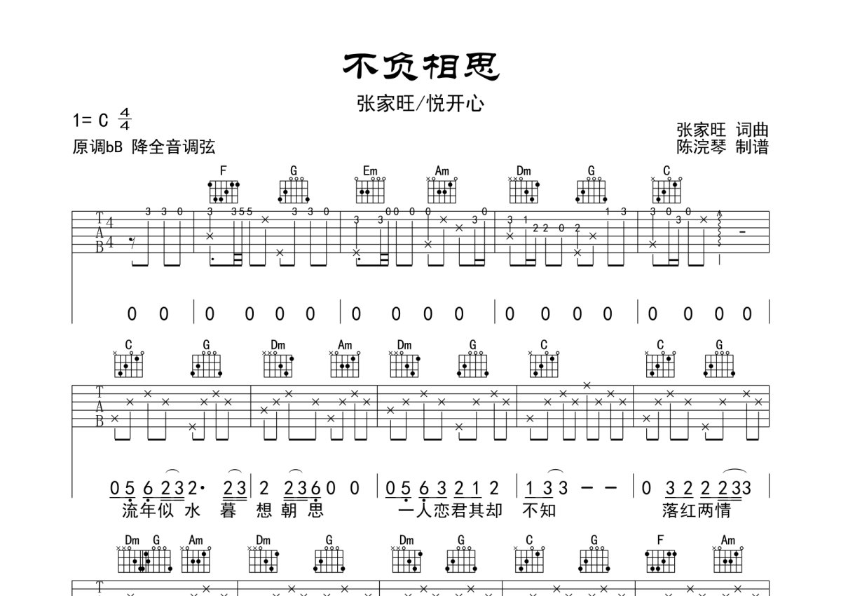 张家旺/悦开心《不负相思》吉他谱 - C调弹唱六线谱 - C调版