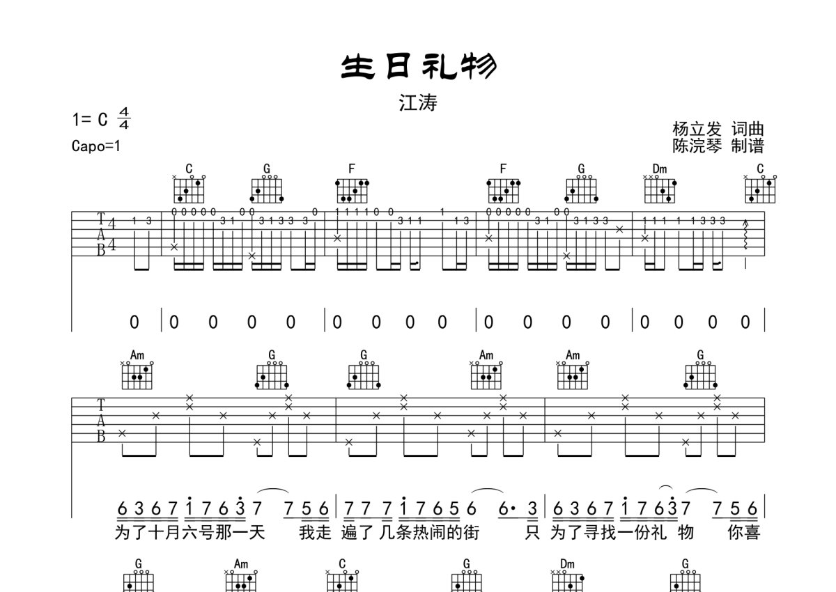 江涛《生日礼物》吉他谱 - C调弹唱六线谱
