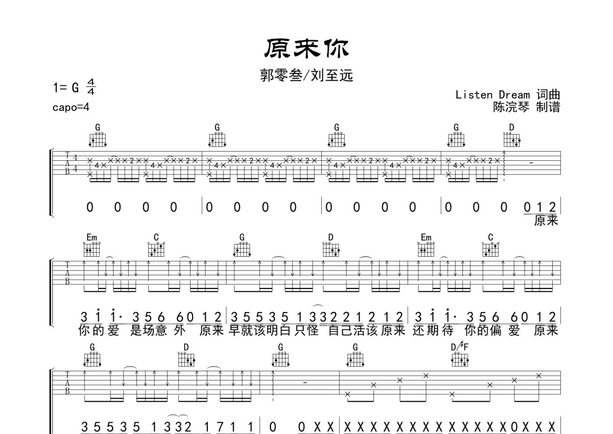 郭零叁/刘至远《原来你》吉他谱 - G调弹唱六线谱