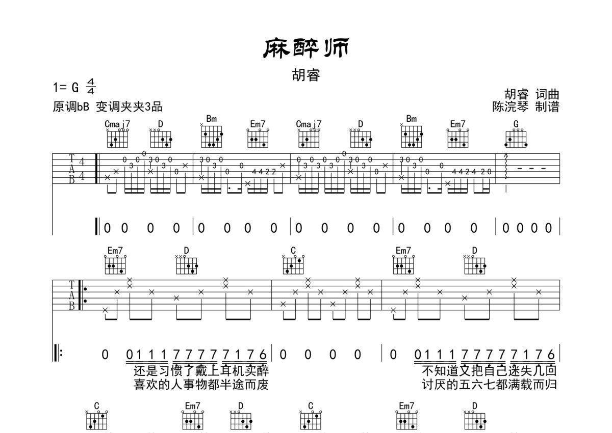 胡睿《麻醉师》吉他谱 - G调弹唱六线谱