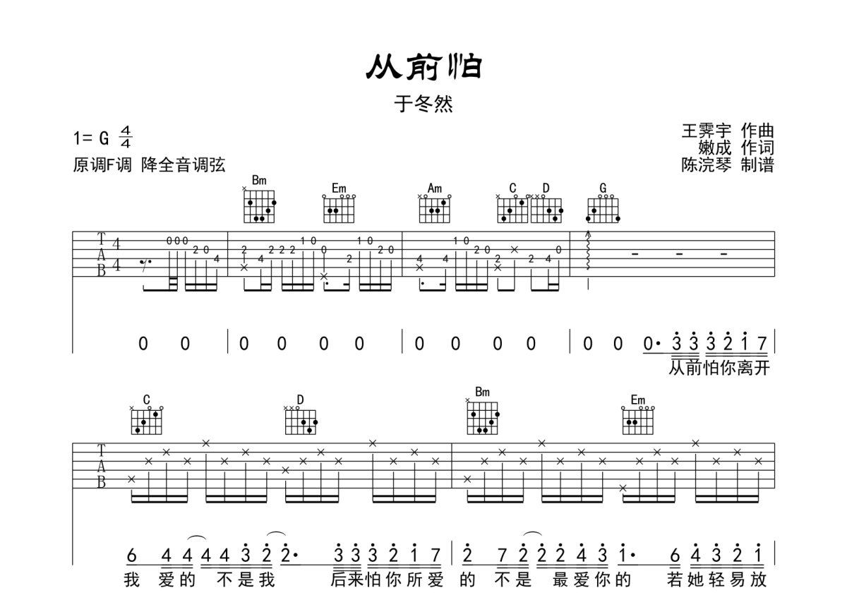于于冬然《从前怕》吉他谱 - G调弹唱六线谱 - G调