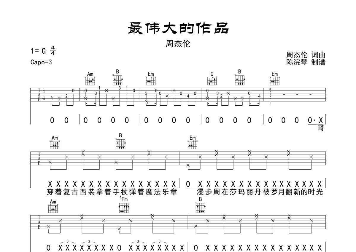 周杰伦《最伟大的作品》吉他谱 - G调弹唱六线谱