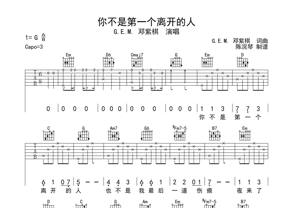 《你不是第一个离开的人》是邓紫棋演唱的一首歌曲,本吉他谱采用的是G调指法编配,这份吉他谱共有三张高清图谱,图谱由 @月隐云先知 编配上传,图谱使用六线谱编配,包含吉他和弦指法、简谱以及歌词部分,使用这份你不是第一个离开的人吉他谱,可以让你更加方便地掌握这首歌曲的弹唱技巧,快来尝试吧。G调指法编配,夹3品。